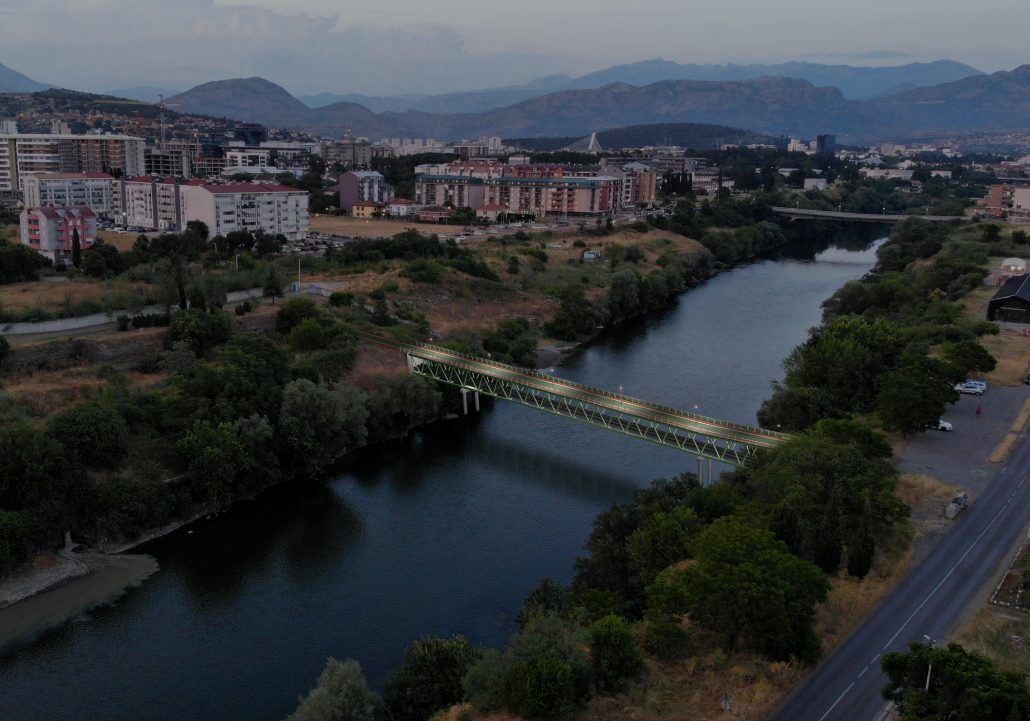 Pješački most na Morači prenosi hidrotehničke instalacije sa desne na lijevu obalu rijeke, tj. služi za sprovođenje infrastrukturnih cjevovoda – dva kanalizaciona kolektora i čelične vodovodne cijevi. Time se povezuju sistemi postojećeg i novog postrojenja za prečišćavanje otpadnih voda. Ovaj segment je koncipiran kao konstrukcija dužine oko 125 metara i širine 6.4 metara. Most ima i dvije bočne biciklističke staze širine od po 1 metar.